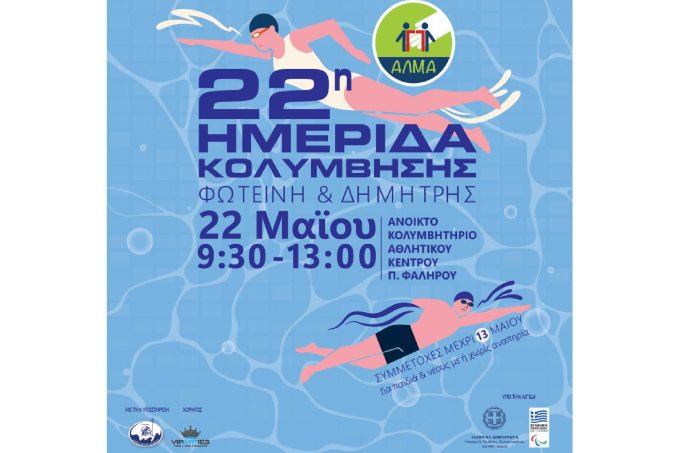 Στο πλαίσιο του προγράμματος ευαισθητοποίησης για τα άτομα με αναπηρία και σε συνεργασία με σχολεία, συλλόγους και σωματεία που αναπτύσσουν το άθλημα της κολύμβησης, για 22η συνεχή χρονιά, το ΑΛΜΑ διοργανώνει Ημερίδα Κολύμβησης «ΦΩΤΕΙΝΗ & ΔΗΜΗΤΡΗΣ».
