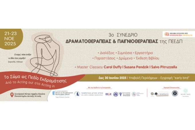 Το 3ο Συνέδριο Δραματοθεραπείας – Παιγνιοθεραπείας διοργανώνει η Πανελλήνια Επαγγελματική Ένωση Δραματοθεραπευτών & Παιγνιοθεραπευτών (Π.Ε.Ε.Δ.Π.) από 21-23 Νοεμβρίου 2025 στο Συνεδριακό Κέντρο Αρχαίου Ελαιώνα του Πανεπιστημίου Δυτικής Αττικής (ΠΑ.Δ.Α.) στο Αιγάλεω.