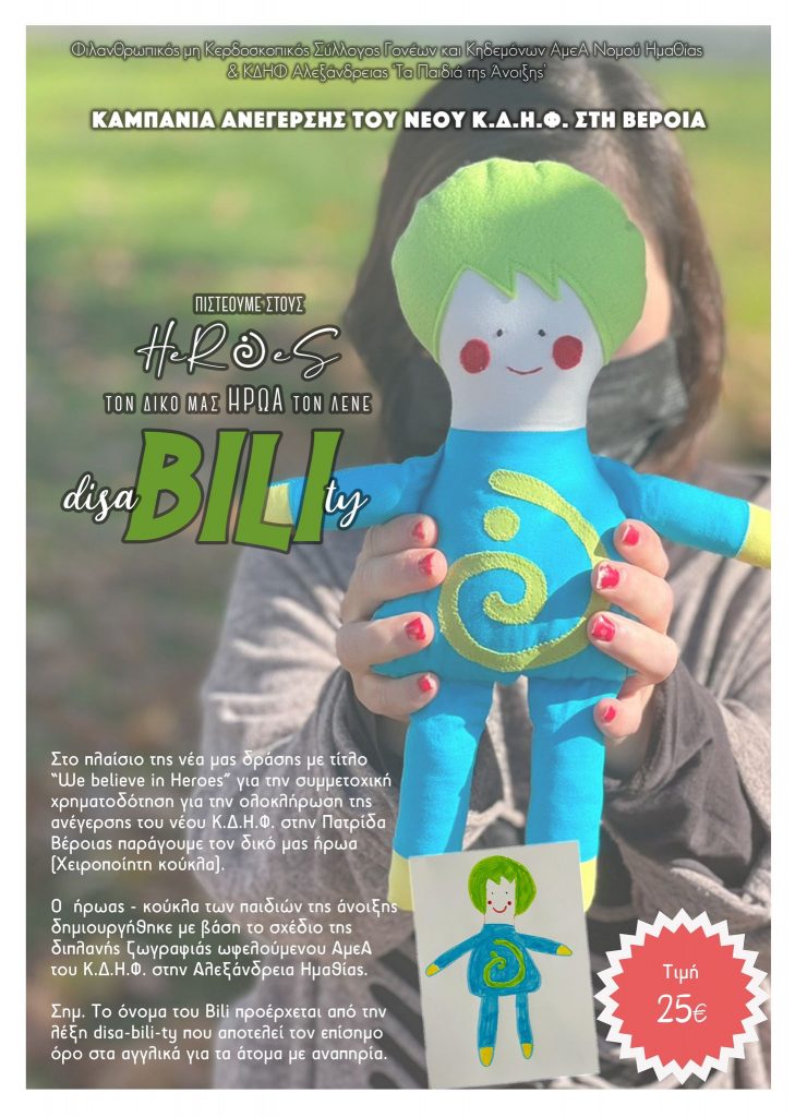 Στο πλαίσιο της νέα μας δράσης του Συλλόγου Γονέων και Κηδεμόνων ΑμεΑ Ν.Ημαθίας με τίτλο “We believe in Heroes” για την συμμετοχική χρηματοδότηση για την ολοκλήρωση της ανέγερσης του νέου Κ.Δ.Η.Φ. στην Πατρίδα Βέροιας διαθέτουμε στο κοινό τον δικό μας ήρωα, μια χειροποίητη κούκλα που ονομάζεται Bili. Ο ήρωας μας,ο Bili, εμφανίστηκε μέσα από μια ανάγκη, την ανάγκη της συνύπαρξης. Εμφανίστηκε μέσα από την ανάγκη των ατόμων με αναπηρίες (persons with disabilities) που αναζητούν την αποδοχή, την ένταξη μέσα στην κοινωνία, κατ’ επέκταση αναζητούν την συνύπαρξη.