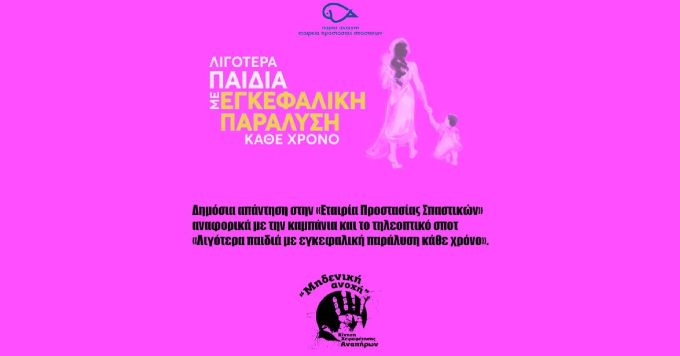 Δημόσια απάντηση στην «Εταιρία Προστασίας Σπαστικών» αναφορικά με την καμπάνια και το τηλεοπτικό σποτ «Λιγότερα παιδιά με εγκεφαλική παράλυση κάθε χρόνο» εξέδωσε η Κίνηση Χειραφέτηση Αναπήρων «Μηδενική Ανοχή».