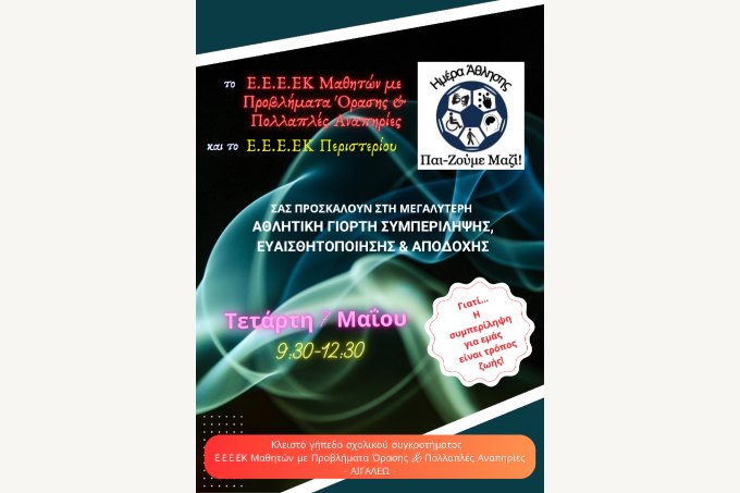Το ΕΕΕΕΚ Μαθητών με Προβλήματα Όρασης & Πολλαπλές Αναπηρίες ενώνει τις δυνάμεις του με το ΕΕΕΕΚ Περιστερίου για να παρουσιάσουν τη μεγαλύτερη συμπεριληπτική γιορτή με τη συμμετοχή σχολικών μονάδων ειδικής και γενικής αγωγής, σε μια προσπάθεια κατανόησης της αναπηρίας, αποδοχής της διαφορετικότητας και σεβασμού της κάθε ανθρώπινης ύπαρξης.