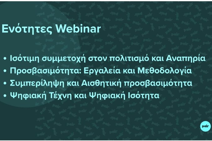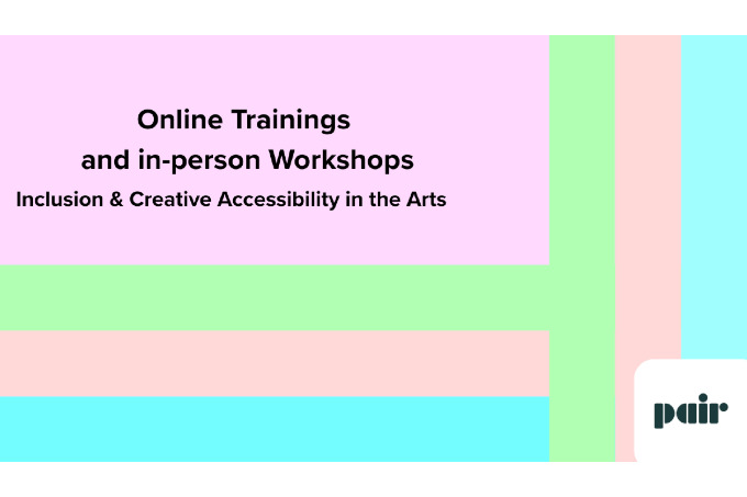 Το P.A.I.R. σας προσκαλεί σε διαδικτυακές και διά ζώσης εκπαιδεύσεις πάνω στην προσβασιμότητα στις ψηφιακές τέχνες! Αν είστε ανερχόμενοι καλλιτέχνες με ή χωρίς αναπηρία, ενδιαφέρεστε ιδιαίτερα για τις ψηφιακές μορφές τέχνης και θέλετε να εξερευνήσετε δημιουργικούς τρόπους για να μοιραστείτε το περιεχόμενο της τέχνης σας με μεγαλύτερη μερίδα κοινού, μη χάσετε τις δωρεάν εκπαιδεύσεις του P.A.I.R. που θα σας προετοιμάσουν για το ανοιχτό κάλεσμα που ακολουθεί.