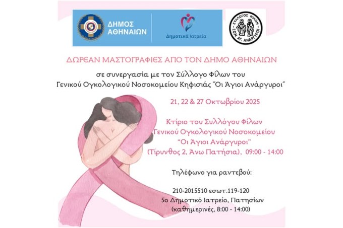 Ο Δήμος Αθηναίων, μέσω του Τμήματος Προληπτικής Ιατρικής, Προαγωγής Υγείας και Δημόσιας Υγείας της Διεύθυνσης Δημοτικών Ιατρείων & Δημόσιας Υγείας, σε συνεργασία με τον Σύλλογο Φίλων του Γενικού Ογκολογικού Νοσοκομείου «Οι Άγιοι Ανάργυροι», διοργανώνει δράση Δωρεάν Μαστογραφικού Ελέγχου για όλες τις γυναίκες.