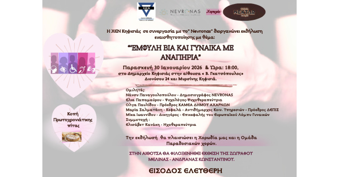 Η ΧΕΝ Κηφισιάς σε συνεργασία με το «Nevronas» διοργανώνει εκδήλωση ευαισθητοποίησης με θέμα: «ΕΜΦΥΛΗ ΒΙΑ ΚΑΙ ΓΥΝΑΙΚΑ ΜΕ ΑΝΑΠΗΡΙΑ».