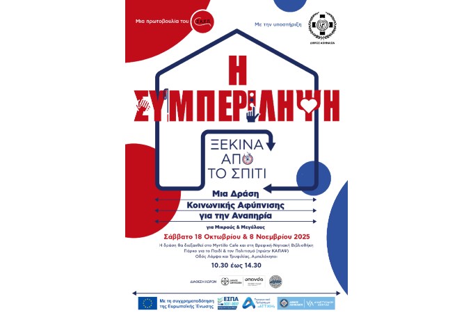 Tο Τμήμα Πολιτικών Ισότητας και Αντιμετώπισης Διακρίσεων της Διεύθυνσης Κοινωνικής Αλληλεγγύης του Δήμου Αθηναίων, η Εντεταλμένη Δημοτική Σύμβουλος Προσβασιμότητας κα Έλενα Μαντζαβίνου και ο Σύνδεσμος Κοινωνικής Ευθύνης για Παιδιά και Νέους (ΣΚΕΠ) οργανώνουν μία Δράση Κοινωνικής Αφύπνισης για την αναπηρία για μικρούς και μεγάλους: το Σάββατο 18 Οκτωβρίου 2025,στην Νηπιακή – Βρεφική Βιβλιοθήκη & στο Myrtillo Cafe,Πάρκο για Παιδί και τον Πολιτισμό(πρώην ΚΑΠΑΨ, οδός Λάμψα και Τρυφιλίας, Αμπελόκηποι), από 10:30 έως 14:30.