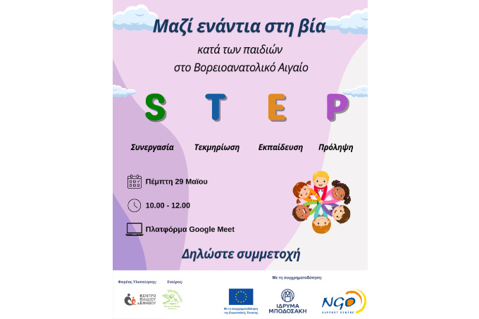 Το Κέντρο Παιδιού και Εφήβου σας προσκαλεί στην εναρκτήρια διαδικτυακή εκδήλωση του έργου Μαζί ενάντια στη βία κατά των παιδιών στο Βορειοανατολικό Αιγαίο (S) Συνεργασία, (T) Τεκμηρίωση, (E) Εκπαίδευση, (P) Πρόληψη – STEP, η οποία θα πραγματοποιηθεί: Πέμπτη 29 Μαΐου 2025 Ώρα: 10:00 – 12:00 Πλατφόρμα: Google Meet.