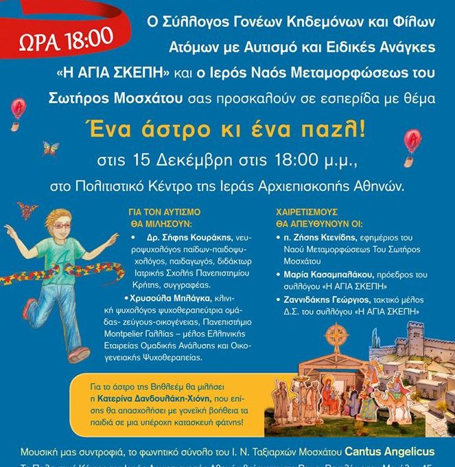 Ο Σύλλογος Γονέων Κηδεμόνων και φίλων Ατόμων με αυτισμό και Ειδικές Ανάγκες “Η ΑΓΙΑ ΣΚΕΠΗ” και ο Ιερός Ναός Μεταμορφώσεως Του Σωτήρος Μοσχάτου σας προσκαλούν σε εσπερίδα με όνομα “Ένα άστρο κι ένα παζλ” την Κυριακή 15 Δεκέμβρη 2019, στις 6:00 μμ, στο Πολιτιστικό Κέντρο Της Ιεράς Αρχιεπισκοπής Αθηνών.