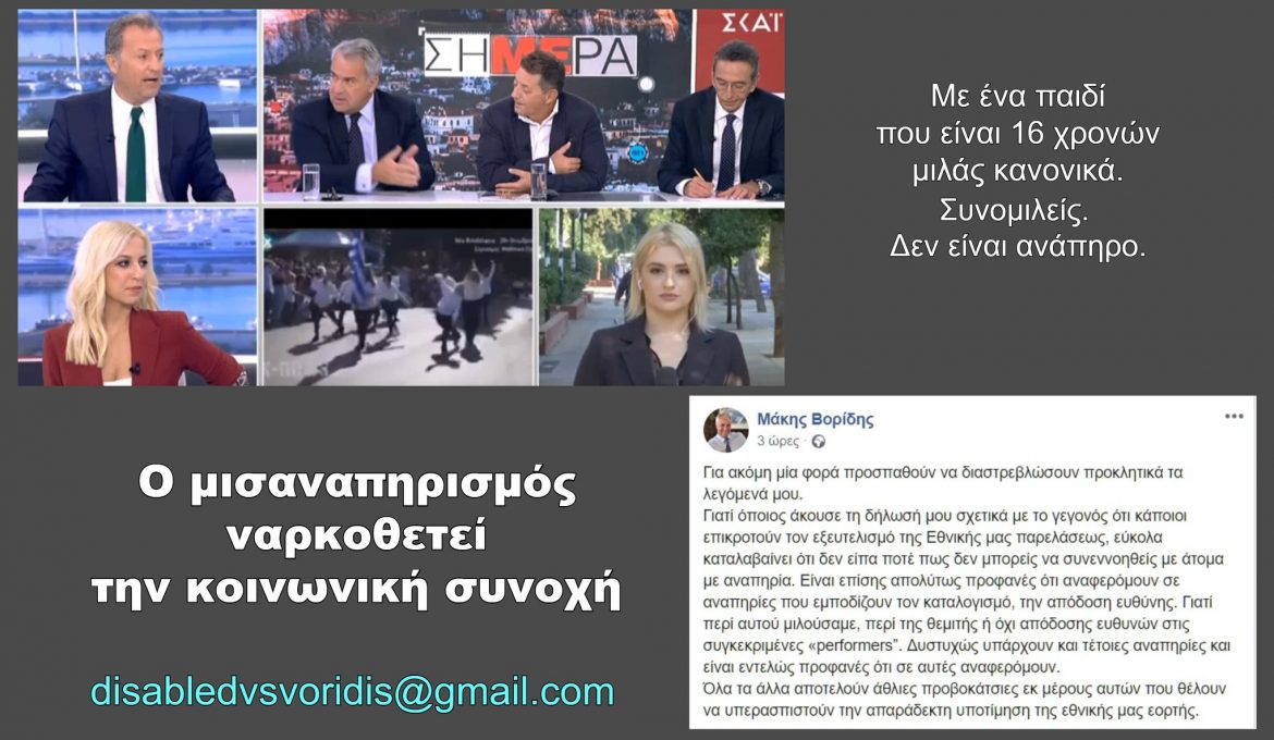 Δηλώνουμε δημόσια ότι προτιθέμεθα να καταγγείλουμε με κάθε νόμιμο μέσο για να προασπίσουμε τα δικαιώματά μας, την τιμή, την υπόληψη και την αξιοπρέπεια των αναπήρων που βρέθηκαν στο επίκεντρο των ακραίων ρατσιστικών δηλώσεων του υπουργού Βορίδη.