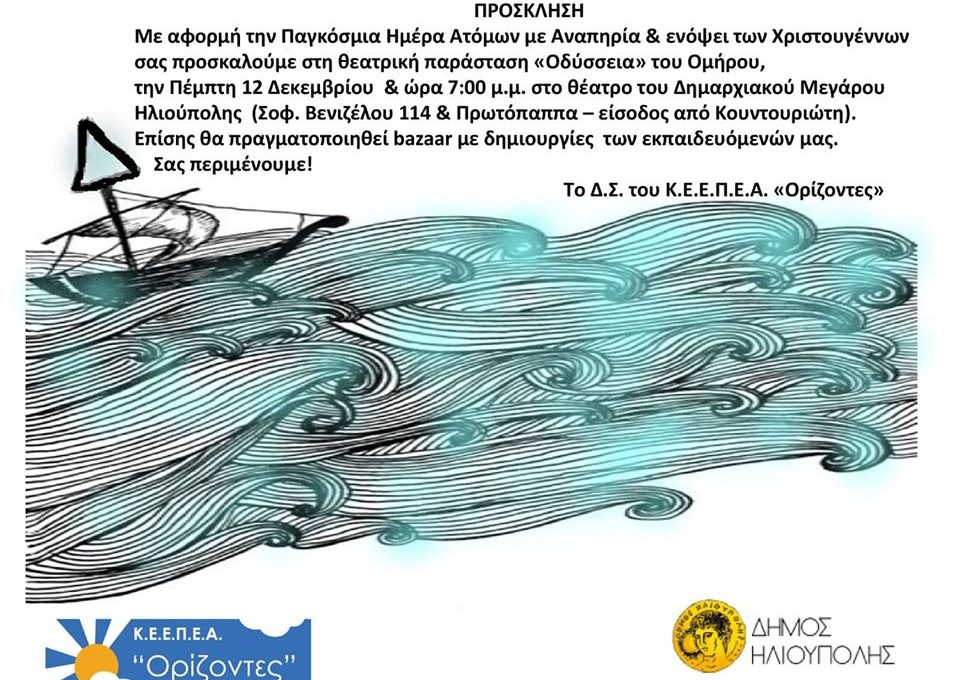 Με αφορμή την Παγκόσμια Ημέρα Ατόμων με Αναπηρία και εν όψει των Χριστουγέννων το Κέντρο ΕΙΔΙΚΗΣ ΕΚΠΑΙΔΕΥΣΗΣ ΠΑΙΔΙΩΝ ΜΕ ΕΙΔΙΚΕΣ ΑΝΑΓΚΕΣ Κ.Ε.Ε.Π.Ε.Α. “Ορίζοντες” μας προσκαλεί στην θεατρική παράσταση “Οδύσσεια” του Ομήρου, την Πέμπτη 12 Δεκεμβρίου 2019 και ώρα 19:00 στο θέατρο του Δημαρχιακού Μεγάρου Ηλιούπολης (Σοφ. Βενιζέλου & Πρωτόπαππα – Είσοδος από την οδό Κουντουριώτη).