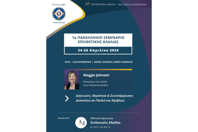 «Επιλεκτική Αλαλία: Διάγνωση και Θεραπεία σε Παιδιά και Εφήβους Συνυπάρχουσες Δυσκολίες» Πανελλήνια Εξειδικευμένη Τριήμερη Εκπαίδευση με τη Maggie Johnson για πρώτη φορά στην Ελλάδα.