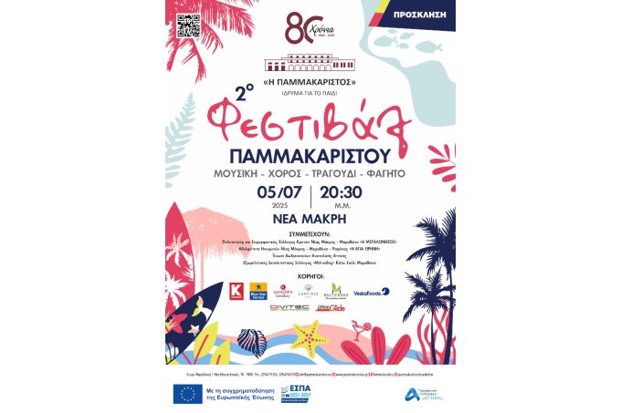 Σας προσκαλούμε στο 2ο Καλοκαιρινό Φεστιβάλ «ΠΑΜΜΑΚΑΡΙΣΤΟΥ», το Σάββατο 5 Ιουλίου 2025 και ώρα 20:30μ.μ.στις εγκαταστάσεις του Ιδρύματος στη Νέα Μάκρη.
