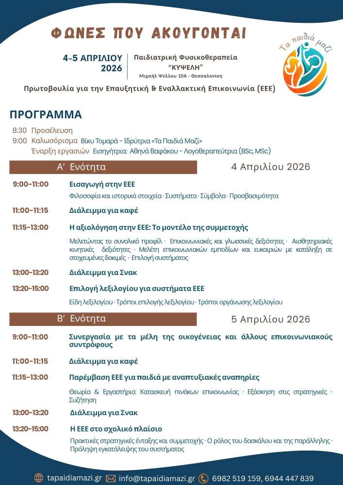 Η εταιρεία «Τα Παιδιά Μαζί» διοργανώνει ένα πρόγραμμα, βασισμένο σε επιστημονικά τεκμηριωμένα δεδομένα, με πρακτικό χαρακτήρα & με εισηγήτρια την λογοθεραπεύτρια Αθηνά Βαφάκου (BSc, MSc), Υπεύθυνη Ομάδας Ειδικού Ενδιαφέροντος για την ΕΕΕ του Πανελλήνιου Συλλόγου Λογοπεδικών.