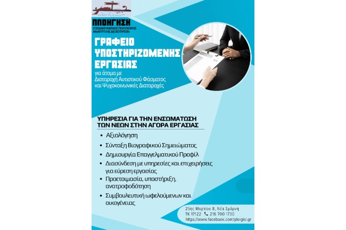 Γραφείο Υποστηριζόμενης Εργασίας της Πλοήγησης: Ένα πρόγραμμα προετοιμασίας και εύρεσης εργασίας για νέους και νέες με αυτισμό υψηλής λειτουργικότητας και ψυχοκοινωνικών δυσκολιών, που βασίζεται στην αρχή ότι όλοι και όλες έχουν δικαίωμα στην εργασία.