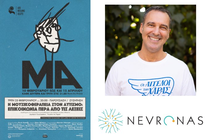 Την Τρίτη 25.2, στις 20:00, στο «Από Μηχανής Θέατρο», στο πλαίσιο της θεατρικής παράστασης «Μα» για τον αυτισμό, μιλάμε για «Η Μουσικοθεραπεία στον αυτισμό: Επικοινωνία πέρα από τις λέξεις», σε μια εκδήλωση που οργάνωσε και έχει επιμεληθεί o Nevronas, σε συνεργασία με την ΑΜΚΕ «Άγγελοι της Χαράς».