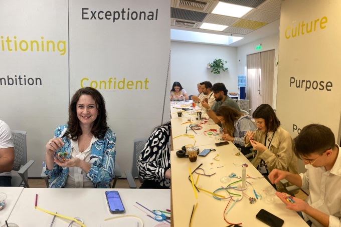 Το εργαστήριο του Αντώνη δεν ήταν απλώς μια γνωριμία των στελεχών της EY Ελλάδος με την τέχνη του Quilling και τη δημιουργία μοτίβων από ρολάκια χαρτιού, αλλά μια ολιστικά βιωματική εμπειρία που ανέδειξε τη δύναμη της νευροδιαφορετικής έκφρασης. Οι συμμετέχοντες/ουσες, με την καθοδήγηση του καλλιτέχνη, δημιούργησαν το ατομικό τους έργο και όλοι μαζί το λογότυπο της EY! Με απλά υλικά, οδοντογλυφίδα και ανακυκλωμένα χαρτιά, ο Αντώνης έδειξε πώς η δημιουργικότητα δεν γνωρίζει κανόνες ή περιορισμούς και πώς η τέχνη μπορεί να γίνει γέφυρα κατανόησης και αποδοχής.