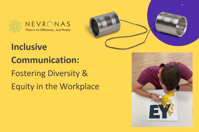 Καθώς ο Μάιος είναι ένας μήνας αφιερωμένος στη διαφορετικότητα, την ισότητα και τη συμπερίληψη, πραγματοποιήσαμε στην EY Ελλάδος τη διαδικτυακή εκπαίδευση «Συμπεριληπτική Επικοινωνία: Προώθηση της διαφορετικότητας και της ισότητας στο χώρο εργασίας», με εισηγήτρια την Στέλλα Καμπούρη, Υπεύθυνη Εκπαιδευτικών Προγραμμάτων του Nevronas, HR Professional & Εκπαιδεύτρια Ατόμων με Αναπηρία, και τον Νίκο Παγίδα, ιδρυτή του Nevronas & Εργοθεραπευτή.