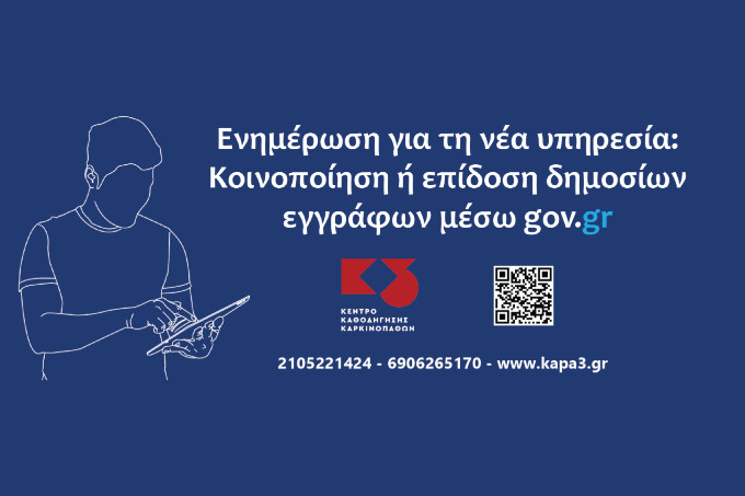 Το Κέντρο Καθοδήγησης Καρκινοπαθών ΚΑΠΑ3 μας ενημερώνει ότι από τον Ιούνιο ξεκίνησε η λειτουργία της νέας υπηρεσίας του gov.gr που επιτρέπει σε δημόσιους φορείς να κοινοποιούν ή να επιβάλλουν επίσημα έγγραφα ψηφιακά στους πολίτες, μέσα από τις ηλεκτρονικές θυρίδες του gov.gr.
