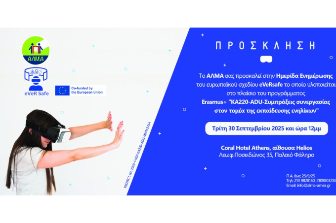 Με ιδιαίτερη χαρά το ΑΛΜΑ μας προσκαλεί στην Ημερίδα Ενημέρωσης του eVeRSafe την Τρίτη 30 Σεπτεμβρίου και ώρες 12.00-15.00 στο Coral Athens Hotel (αίθουσα Helios) στο Παλαιό Φάληρο.