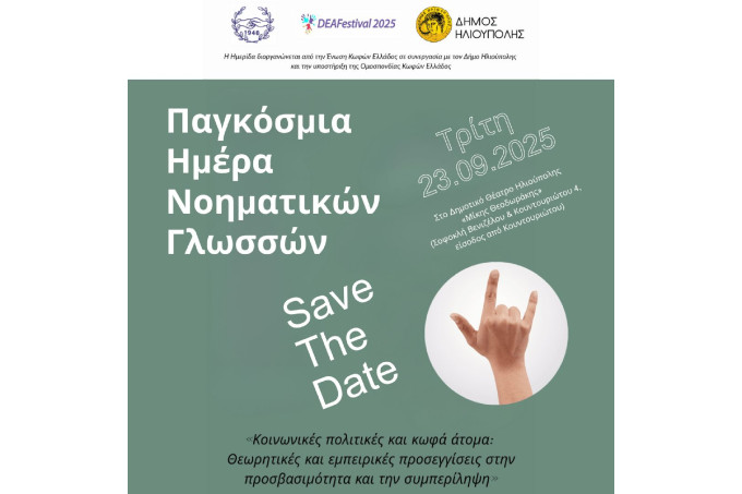 Με αφορμή την Παγκόσμια Ημέρα Νοηματικών Γλωσσών, η Ένωση Κωφών Ελλάδος σε συνεργασία με τον Δήμο Ηλιούπολης διοργανώνουν μια Ημερίδα ενημέρωσης και ευαισθητοποίησης με στόχο την ανάδειξη της νοηματικής γλώσσας ως εργαλείο προσβασιμότητας και την προώθηση της ισότιμης συμμετοχής των κωφών/βαρήκοων πολιτών στην κοινωνία.