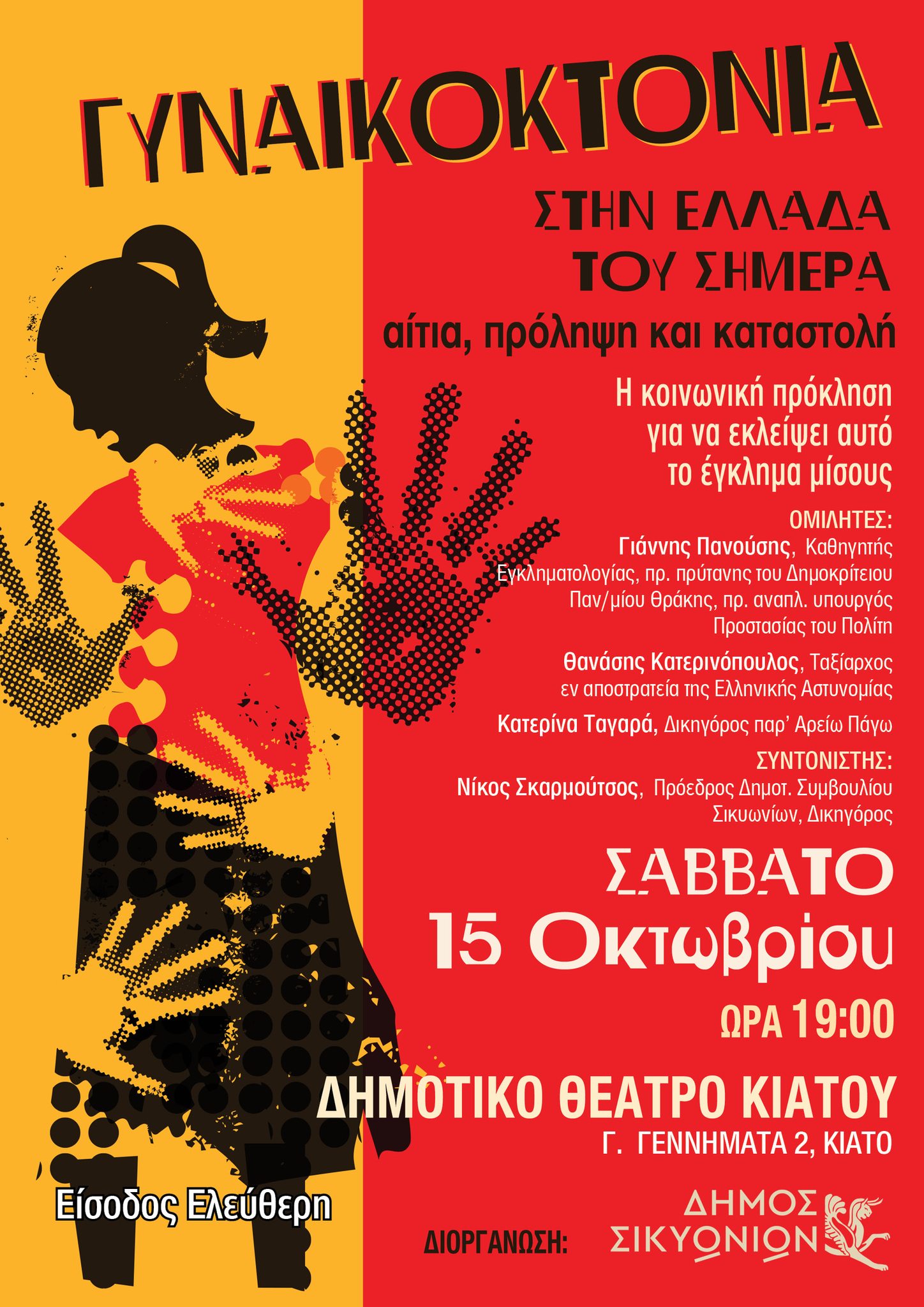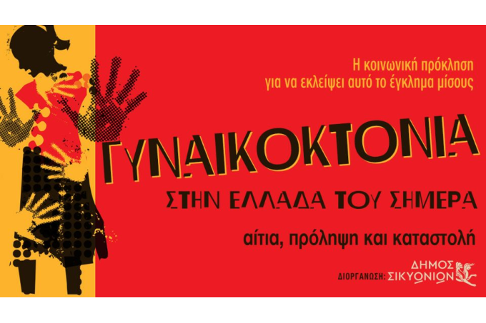 Μια σημαντική εκδήλωση για τις γυναικοκτονίες θα πραγματοποιηθεί στο Δημοτικό Θέατρο Κιάτου, το Σάββατο 15 Οκτωβρίου, ώρα 7:00 το απόγευμα. Πρόκειται για μία ημερίδα/συζήτηση που διοργανώνει ο Δήμος Σικυωνίων με θέμα: «Γυναικοκτονία στην Ελλάδα του σήμερα. Αίτια, πρόληψη και καταστολή».