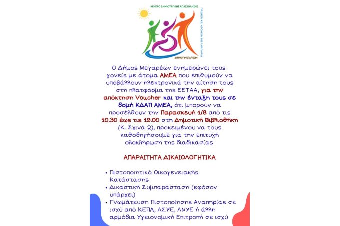 Ο Δήμος Μεγαρέων ενημερώνει τους γονείς με άτομα ΑΜΕΑ που επιθυμούν να υποβάλλουν ηλεκτρονικά την αίτησή τους στη πλατφόρμα της ΕΕΤΑΑ, για την απόκτηση Voucher και την ένταξή τους σε δομή ΚΔΑΠ ΑΜΕΑ, ότι μπορούν να προσέλθουν την Παρασκευή 1/8 από τις 10:30 έως τις 19:00 στη Δημοτική Βιβλιοθήκη (Κ. Σχινά 2), προκειμένου να τους καθοδηγήσουμε για την επιτυχή ολοκλήρωση της διαδικασίας.