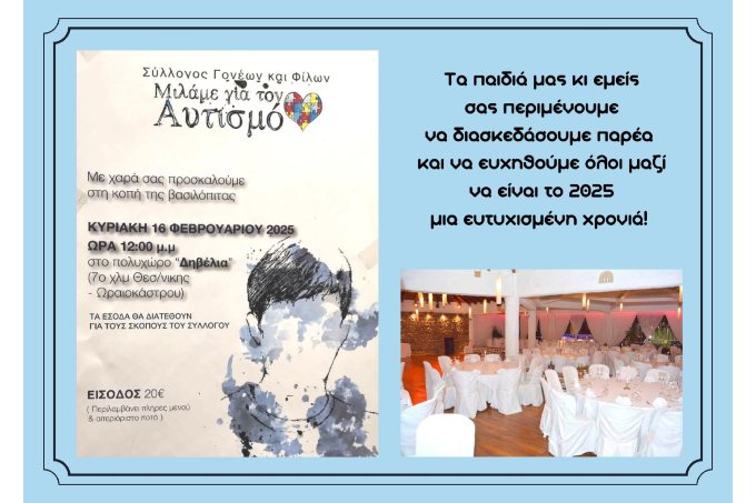 Την Κυριακή 16 Φεβρουαρίου 2025 και ώρα 12 το μεσημέρι θα πραγματοποιηθεί ο ετήσιος χορός του συλλόγου «ΜΙΛΑΜΕ ΓΙΑ ΤΟΝ ΑΥΤΙΣΜΟ» για την κοπή της βασιλόπιτάς μας. Μια ευκαιρία για να ανταμωσουμε όλοι μαζί και μέσα σε κλίμα χαράς και αισιοδοξίας να ξεκινήσουμε τη νέα χρονιά.