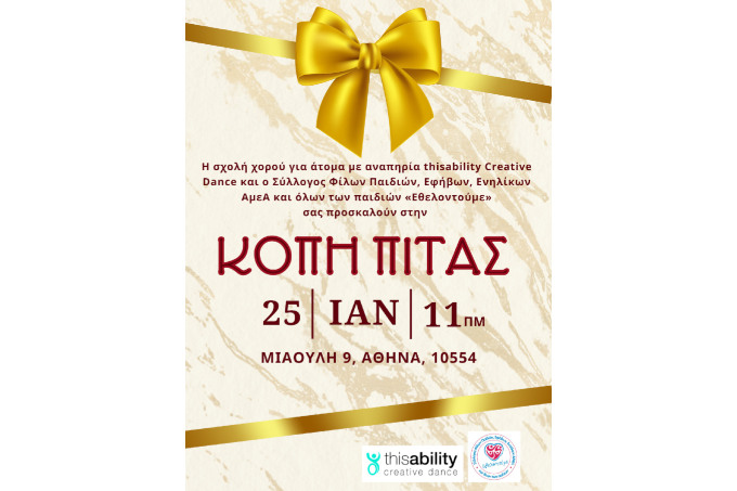 Ο Σύλλογος Φίλων Παιδιών, Εφήβων, Ενηλίκων ΑμεΑ και όλων των παιδιών «Εθελοντούμε» και η σχολή χορού για άτομα με αναπηρία thisability Creative Dance σας προσκαλεί στην κοπή της πίτας τους!