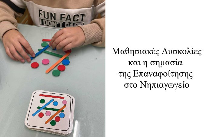 Οι δυσκολίες αυτές, γνωστές ως μαθησιακές δυσκολίες, χρειάζονται έγκαιρη αναγνώριση και υποστήριξη, ώστε το παιδί να αποκτήσει τις απαραίτητες δεξιότητες πριν τη μετάβασή του στο Δημοτικό.