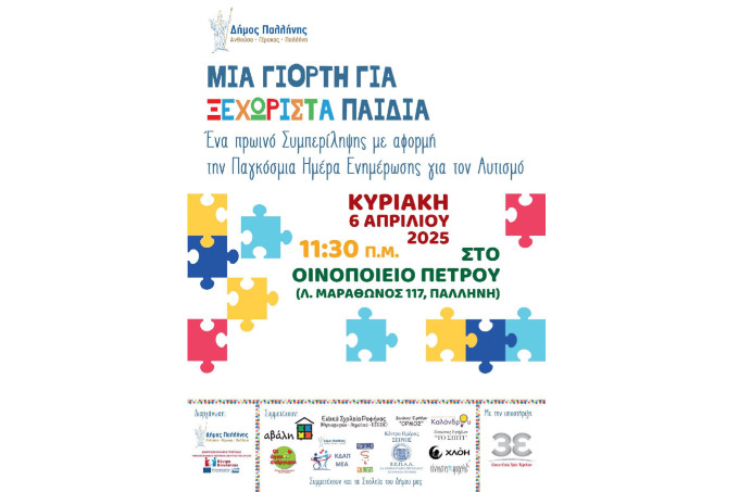 Ελάτε να συμπληρώσουμε το παζλ της συμπερίληψης, ΟΛΟΙ ΜΑΖΙ, σε «Μία Γιορτή για Ξεχωριστά Παιδιά», την Κυριακή 6 Απριλίου 2025, στις 11:30 το πρωί, στο Οινοποιείο Πέτρου, στην Παλλήνη!