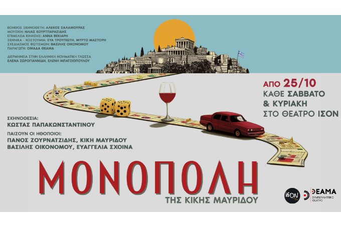Η επαγγελματική θεατρική ομάδα ΘΕΑΜΑ κάνει πρεμιέρα το Σάββατο 25 Οκτωβρίου στις 21:00 μ.μ. στο θέατρο ΊΣΟΝ με το νέο έργο της Κικής Μαυρίδου με τίτλο «Μονόπολη».