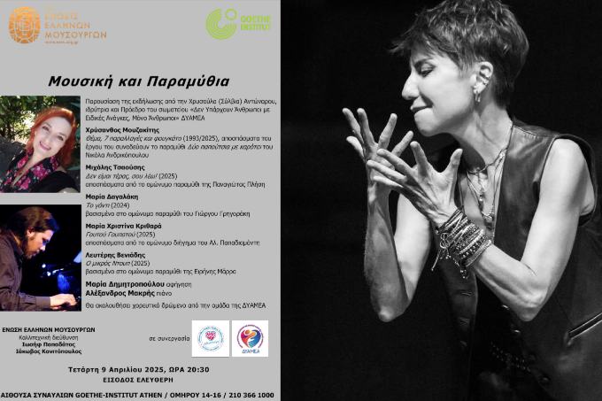 Η Ένωση Ελλήνων Μουσουργών, σε συνεργασία με τον Σύλλογο Φίλων Παιδιών, Εφήβων, Ενηλίκων ΑμεΑ και όλων των παιδιών «Εθελοντούμε», καθώς και το σωματείο «Δεν Υπάρχουν Άνθρωποι με Ειδικές Ανάγκες, Μόνο Άνθρωποι» (ΔΥΑΜΕΑ), σας προσκαλεί στην εκδήλωση «Μουσική και Παραμύθια», μια μοναδική εμπειρία.