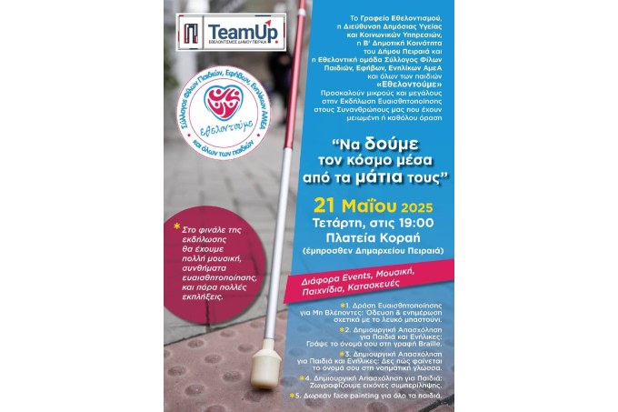 Ο Σύλλογος Φίλων Παιδιών, Εφήβων, Ενηλίκων ΑμεΑ και όλων των παιδιών «Εθελοντούμε», σε συνεργασία με το Γραφείο Εθελοντισμού, τη Διεύθυνση Δημόσιας Υγείας και Κοινωνικών Υπηρεσιών και τη Β’ Δημοτική Κοινότητα Δήμου Πειραιά, διοργανώνουν μια μεγάλη ημερίδα ευαισθητοποίησης και συμπερίληψης με σύνθημα «Να δούμε τον κόσμο μέσα από τα μάτια τους».