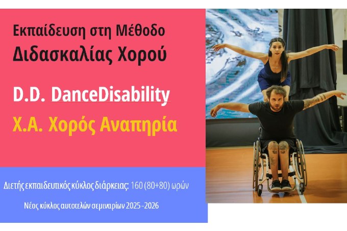 Εκπαίδευση στη Μέθοδο Διδασκαλίας Χορού D.D. DanceDisability X.A. Χορός Αναπηρία σε Διετή εκπαιδευτικό κύκλο διάρκειας: 160 (80+80) ωρών από τις Δρυάδες Εν Πλω. Νέος κύκλος αυτοτελών σεμιναρίων 2025 -2026. (ΔΙΑΔΙΚΤΥΑΚΑ ΚΑΙ ΔΙΑ ΖΩΣΗΣ)