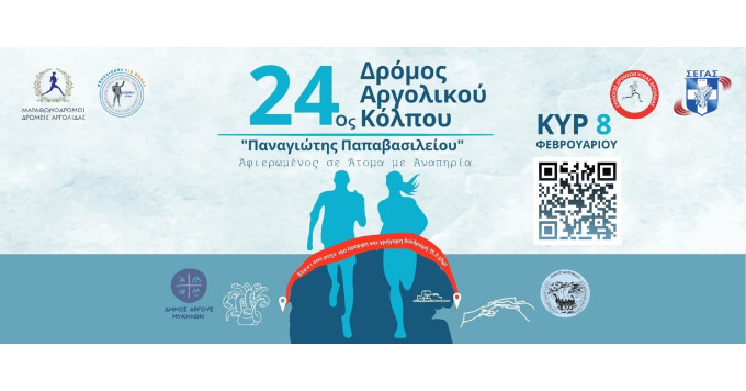 Ο Σύλλογος Μαραθωνοδρόμων & Δρομέων Αργολίδας (μέλος της Ε.Ο.Σ.Λ.Μ.Α.Υ.), σε συνεργασία με τον Σύλλογο Δρομέων Υγείας Αργολίδας, με την έγκριση του Σ.Ε.Γ.Α.Σ. και με τη θεσμική υποστήριξη των Δήμων Άργους – Μυκηνών και Ναυπλιέων, ανακοινώνει επίσημα τη διεξαγωγή του 24ου Δρόμου Αργολικού Κόλπου «Παναγιώτης Παπαβασιλείου», την Κυριακή 8 Φεβρουαρίου 2026.