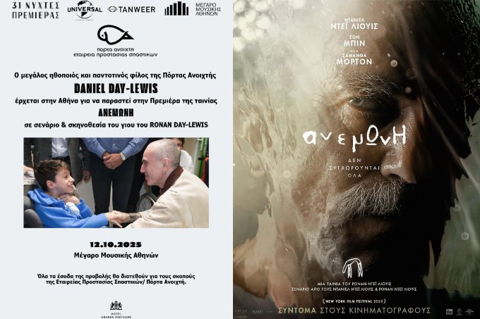 H πανελλήνια πρεμιέρα, παρουσία του σπουδαίου Daniel Day Lewis, πραγματοποιείται για τους σκοπούς της Εταιρείας Προστασίας Σπαστικών/ Πόρτα Ανοιχτή σε συνεργασία με το 31ο Διεθνές Φεστιβάλ Κινηματογράφου της Αθήνας Νύχτες Πρεμιέρας και το Μέγαρο Μουσικής Αθηνών και θα διεξαχθεί την Κυριακή, 12 Οκτωβρίου 2025, ώρα 7:00 μ.μ. στην Αίθουσα Τριάντη του Μεγάρου Μουσικής Αθηνών (Βασ. Σοφίας και Κόκκαλη, Αθήνα).
