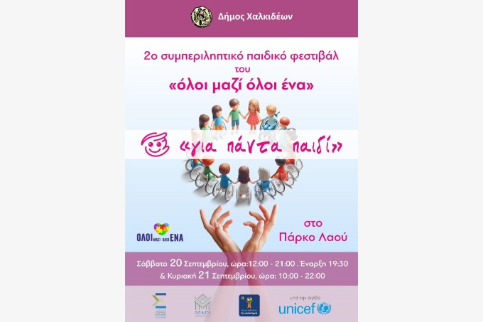 Ο Δήμος Χαλκιδέων, για δεύτερη συνεχή χρονιά, διοργανώνει το Συμπεριληπτικό Παιδικό Φεστιβάλ, που τελεί υπό την αιγίδα της UNICEF και πραγματοποιείται με την υποστήριξη της Περιφέρειας Στερεάς Ελλάδας και του Ο.ΠΑ.ΣΤ.Ε, με τη συνεργασία σχολείων, συλλόγων, φορέων και εθελοντικών οργανώσεων.