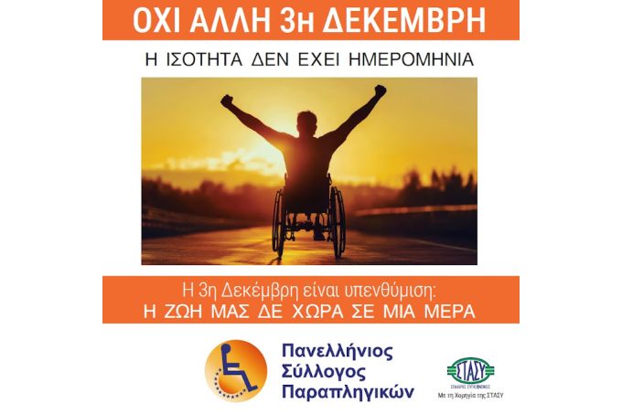 Το σλόγκαν του Πανελλήνιου Συλλόγου Παραπληγικών (ΠΑ.Σ.ΠΑ.) για την 3η Δεκεμβρίου, την Παγκόσμια Ημέρα Ατόμων με Αναπηρία, είναι ένας δυνατός κριτικός στοχασμός: «Όχι άλλη 3 Δεκέμβρη η ισότητα δεν έχει ημερομηνία, η 3 Δεκέμβρη είναι μια υπενθύμιση η ζωή μας δε χωρά σε μια μέρα.»