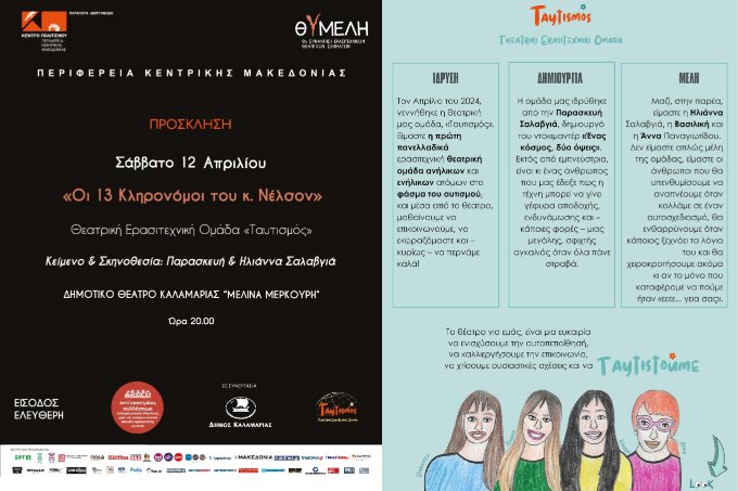 Η νέα πρωτότυπη θεατρική παραγωγή από την ομάδα «Ταυτισμός» – την πρώτη Πανελλαδικά Ερασιτεχνική Ομάδα με ενήλικες και ανήλικους αυτιστικούς, με τίτλο «Οι 13 Κληρονόμοι του κ. Νέλσον» σε πρωτότυπο κείμενο και σκηνοθεσία των Παρασκευή & Ηλιάννας Σαλαβγιά η οποία θα παρουσιαστεί στην 9η Συνάντηση Ερασιτεχνικών Θεατρικών Σχημάτων ”ΘΥΜΕΛΗ” του Κέντρου Πολιτισμού της Περιφέρειας Κεντρικής Μακεδονίας, στις 12 Απριλίου στις 20:00 στο Δημοτικό Θέατρο Καλαμαριάς «Μελίνα Μερκούρη».