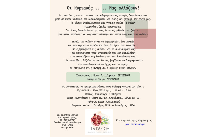 «Οι Κυριακές που αλλάζουν ζωές…» Ομάδες Αυτογνωσίας από το Κέντρο Ψυχικής Υγείας «Το ΡοδιΟν»: Μια ουσιαστική συνάντηση με τον εαυτό