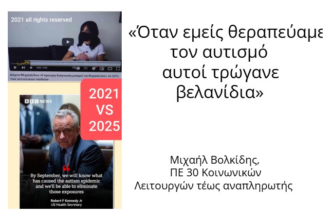 Εδώ ερχόμαστε πίσω στα δικά μας γιατί, όταν αυτοί τρώγανε ακόμα βελανίδια, η Υφυπουργός που έκανε και μια γύρα από το ΥΠΑΙΘΑ, κα. Δόμνα Μιχαηλίδου σε συνέντευξη της το μακρινό 2021, δήλωνε «Η έγκαιρη διάγνωση οδηγεί και στην πρώιμη παρέμβαση, που είναι το Α και το Ω για την εξέλιξη ενός αυτιστικού παιδιού. Και με τη σωστή και έγκαιρη παρέμβαση, μπορεί το 50% των παιδιών αυτών, να βοηθηθούν και τελικά μέχρι και να βγουν από το φάσμα του αυτισμού»!! Και δικαίως λοιπόν ο τίτλος του βίντεο της συνέντευξης «Δόμνα Μιχαηλίδου: Η πρώιμη διάγνωση μπορεί να θεραπεύσει το 50% των αυτιστικών παιδιών.»