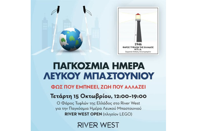 Με αφορμή την Παγκόσμια Ημέρα Λευκού Μπαστουνιού, ο Φάρος Τυφλών της Ελλάδος έρχεται στο River West, την Τετάρτη 15 Οκτωβρίου (12:00–19:00), για μια ξεχωριστή δράση ενημέρωσης και ευαισθητοποίησης.