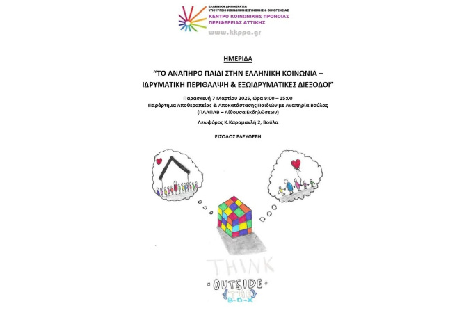 Την Παρασκευή 7 Μαρτίου 2025 και ώρα 9:00 – 15:00, το Παράρτημα Αποθεραπείας & Αποκατάστασης Παιδιών με Αναπηρία Βούλας (ΠΑΑΠΑΒ – ΑΙΘΟΥΣΑ ΕΚΔΗΛΩΣΕΩΝ), διοργανώνει Ημερίδα με θέμα: «ΤΟ ΑΝΑΠΗΡΟ ΠΑΙΔΙ ΣΤΗΝ ΕΛΛΗΝΙΚΗ ΚΟΙΝΩΝΙΑ – ΙΔΡΥΜΑΤΙΚΗ ΠΕΡΙΘΑΛΨΗ & ΕΞΩΙΔΡΥΜΑΤΙΚΕΣ ΔΙΕΞΟΔΟΙ».