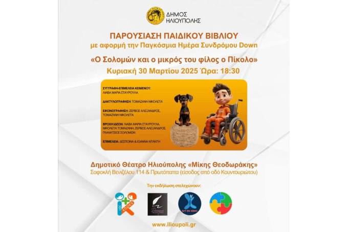 Ο Δήμος Ηλιούπολης με αφορμή την Παγκόσμια Ημέρα Συνδρόμου Down και την Παγκόσμια Ημέρα Ενημέρωσης για τον Αυτισμό, έχει την τιμή να σας προσκαλέσει την Κυριακή 30 Μαρτίου στις 18:30 μ.μ. στο Δημοτικό Θέατρο Ηλιούπολης «Μίκης Θεοδωράκης» όπου θα γίνει η παρουσίαση του παιδικού βιβλίου «Ο Σολομών και ο μικρός του φίλος ο Πίκολο» το οποίο έγραψαν και εικονογράφησαν ενήλικες με εγκεφαλική παράλυση της ΑΜΚΕ «Ιοί και Κόρες».