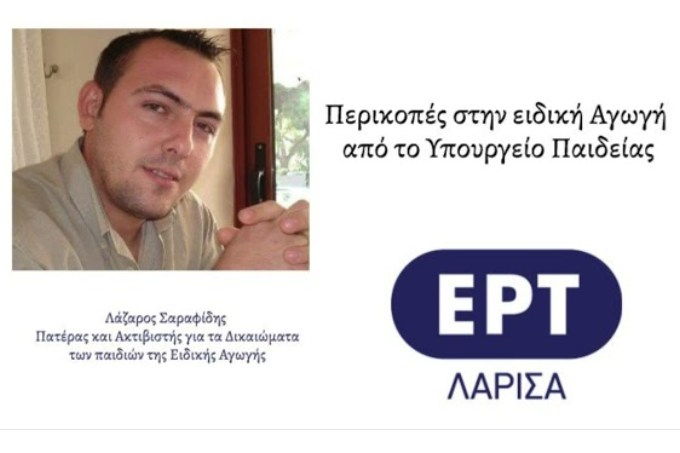 Ο Λάζαρος Σαραφίδης, Πατέρας και Ακτιβιστής για τα Δικαιώματα των παιδιών της Ειδικής Αγωγής, μίλησε στην εκπομπή «Θεσσαλικό Περισκόπιο» στην ΕΡΤ Λάρισας και τη δημοσιογράφο Δώρα Μήτρα, για τις περικοπές στην Ειδική Αγωγή που όπως είπε γίνονται από το Υπουργείο Παιδείας.