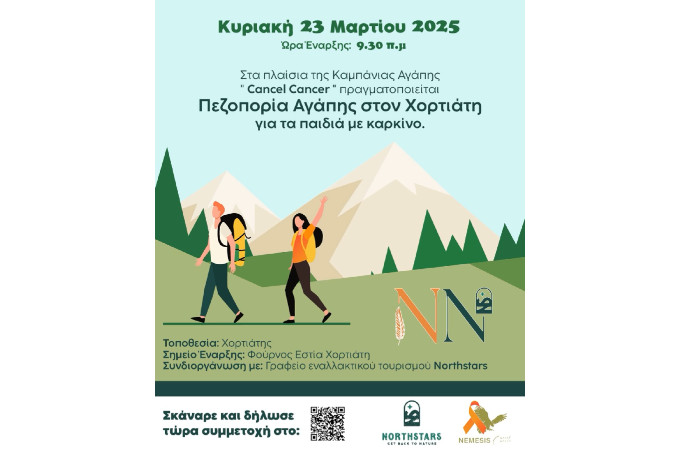 Το σωματείο ΝΕΜΕΣΙΣ πιστό στην Εκστρατεία Αγάπης “Cancel Cancer – Διαψεύδουμε τον καρκίνο και χαράζουμε ξανά τη ζωή των παιδιών από εκεί που την άφησαν”, σε συνεργασία με το γραφείο εναλλακτικού τουρισμού, Northstars, διοργανώνουν φιλανθρωπική πεζοπορία στο βουνό του Χορτιάτη.
