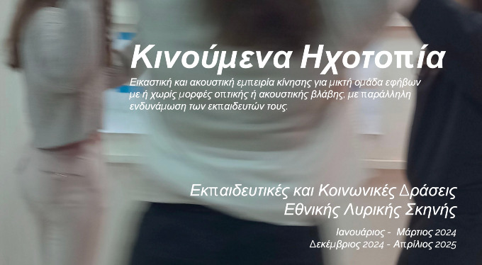 120 μαθήτριες/ες με ή χωρίς οπτική ή ακουστική βλάβη και 19 εκπαιδευτικοί από 5 Γυμνάσια-Λύκεια ειδικής και μη αγωγής της Αττικής θα μας παρασύρουν σε μία συναρπαστική πολυαισθητηριακή περιπατητική διαδρομή. Ξεκινώντας από τα Νότια Μονοπάτια θα συναντήσουμε μικτές ομάδες εφήβων τοποθετημένες σε διαδοχικά σημεία των μονοπατιών. Οι ομάδες, στη μορφή «ενεργοποιημένων γλυπτών», θα παρουσιάσουν τις χορογραφίες που δημιούργησαν τα παιδιά μέσα από τη βιωματική εκπαιδευτική διαδικασία των Κινούμενων Ηχοτοπίων που είχαν ως στόχο την ανάπτυξη μιας εξωλεκτικής γλώσσας επικοινωνίας που ενθαρρύνει την συμμετοχή των εφήβων με αναπηρία σε καλλιτεχνικές δράσεις και την τόνωση της δημιουργικότητάς τους, και κυρίως την αλληλεπίδραση μέσα σε μικτές ομάδες ατόμων με ή χωρίς αναπηρία. Στη συνέχεια, μαθητές και κοινό θα κατευθυνθούν προς τον Θόλο, όπου θα παρακολουθήσουν μία εικαστική εγκατάσταση από βίντεο και ηχητικό υλικό των παιδιών, εμπνευσμένο από την εμπειρία της συμμετοχής τους στα Κινούμενα Ηχοτοπία.