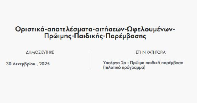 Το Υπουργείο Κοινωνικής Συνοχής και Οικογένειας και η Ελληνική Εταιρεία Τοπικής Ανάπτυξης και Αυτοδιοίκησης ανακοινώνουν τα οριστικά αποτελέσματα των αιτήσεων για το Πρόγραμμα Πρώιμης Παιδικής Παρέμβασης, το οποίο απευθύνεται σε παιδιά ηλικίας έως 6 ετών με αναπηρία, αναπτυξιακές δυσκολίες ή αυξημένο κίνδυνο εμφάνισής τους, καθώς και στις οικογένειές τους.