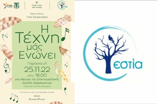Η ΕΣΤΙΑ συνδιοργανώνει με την Ελληνογαλλική Σχολή Ουρσουλινών και το 1ο Γενικό Λύκειο Νέου Ψυχικού, υπό την αιγίδα του Δήμου Φιλοθέης – Ψυχικού, και μας … Συνεχίστε να διαβάζετε το “Η Τέχνη μάς ενώνει” και “Ορνιθοσκαλίσματα” από την ΕΣΤΙΑ!.
