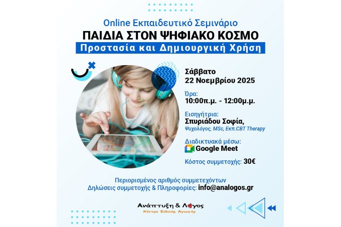 Σας περιμένουμε σε μια διαδραστική διαδικτυακή συνάντηση διαλόγου και προβληματισμού γύρω από τις προκλήσεις και τις ευκαιρίες της ψηφιακής εποχής για τα παιδιά μας.