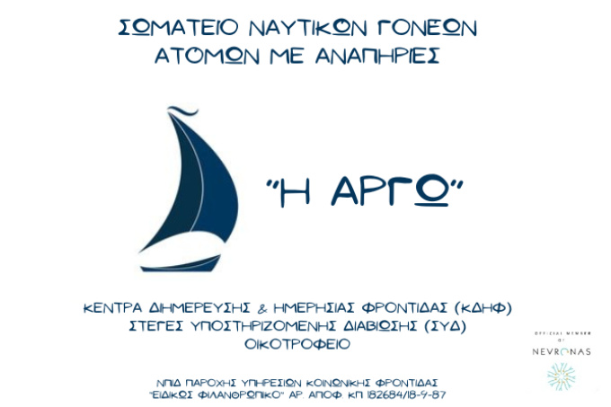 Το Σωματείο Ναυτικών Γονέων Ατόμων με Αναπηρίες «Η ΑΡΓΩ», ιδρύθηκε το 1985 με πρωτοβουλία μητέρων παιδιών με νοητική αναπηρία, συζύγους ναυτικών. Είναι πιστοποιημένο Ν.Π.Ι.Δ παροχής υπηρεσιών Πρωτοβάθμιας και Δευτεροβάθμιας Κοινωνικής Φροντίδας, που προσφέρει εκπαίδευση, υποστήριξη, στέγη σε νέους/νέες με Νοητική Υστέρηση ή/και Διαταραχές Αυτιστικού Φάσματος.
